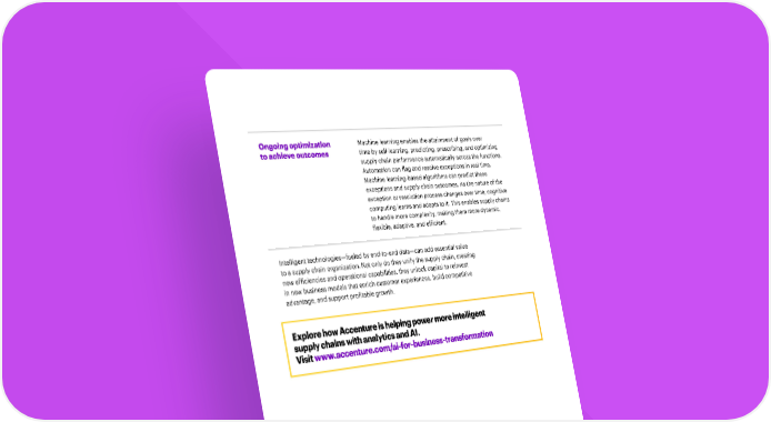 Ongoing optimization Machine learning enables the attainment of goals over to achieve outcomes time by self-learning, predicting, prescribing, and optimizing supply chain performance automatically across the functions. Automation can flag and resolve exceptions in real time. Machine learning-based algorithms can predict these exceptions and supply chain outcomes. As the nature of the exception or resolution process changes over time, cognitive computing learns and adapts to it. This enables supply chains to handle more complexity, making them more dynamic, flexible, adaptive, and efficient. Intelligent technologies—fueled by end-to-end data—can add essential value to a supply chain organization. Not only do they unify the supply chain, creating new efficiencies and operational capabilities, they unlock capital to reinvest in new business models that enrich customer experiences, build competitive advantage, and support profitable growth. Explore how Accenture is helping power more intelligent supply chains with analytics and AI. Visit www.accenture.com/ai-for-business-transformation INTELLIGENT SUPPLY CHAIN REINVENTING THE SUPPLY CHAIN WITH AI 9