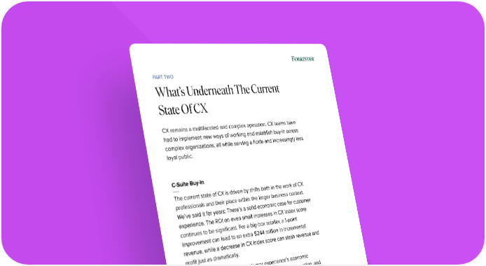 PART TWO What’s Underneath The Current State Of CX CX remains a multifaceted and complex operation. CX teams have had to implement new ways of working and establish buy-in across complex organizations, all while serving a fickle and increasingly less loyal public. C-Suite Buy-In The current state of CX is driven by shifts both in the work of CX professionals and their place within the larger business context. We’ve said it for years: There’s a solid economic case for customer experience. The ROI on even small increases in CX Index score continues to be significant. For a big-box retailer, a 1-point improvement can lead to an extra $244 million in incremental revenue, while a decrease in CX Index score can slash revenue and profit just as dramatically. The C-suite is recognizing customer experience’s economic potential. Facing the dangers of disintermediation, disruption, and stockholders’ demands for quarterly profits, executives are seeking new ways of gaining and retaining market share. CX success stories, both internally and in the wider market, are grabbing their attention. © 2019 Forrester Research, Inc.