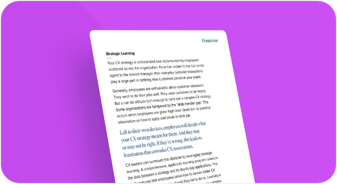 Strategic Learning Your CX strategy is orchestrated and implemented by employees scattered across the organization. From the cashier to the call center agent to the branch manager, their everyday customer interactions play a large part in defining how customers perceive your brand. Generally, employees are enthusiastic about customer obsession. They want to do their jobs well. They want customers to be happy. But a can-do attitude isn’t enough to carry out a complex CX strategy. Some organizations are hampered by the “skills transfer gap.” This occurs when employees are given high-level ideals but no practical information on how to apply said ideals to their job. Left to their own devices, employees will decide what your CX strategy means for them. And they may or may not be right. If they’re wrong, this leads to frustration that corrodes CX momentum. CX leaders can surmount this obstacle by leveraging strategic learning. A comprehensive, applicable learning program connects the dots between a strategy and its day-to-day applications. This clarity ensures that employees know how to deliver stellar CX and can be held accountable should they fail to do so. Learning is critical to curating a unified customer experience across complex organizations with multiple touchpoints. © 2019 Forrester Research, Inc.