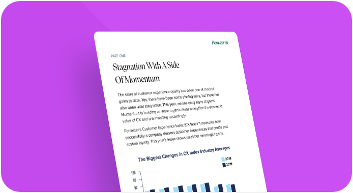 PART ONE Stagnation With A Side Of Momentum The story of customer experience quality has been one of modest gains to date. Yes, there have been some shining stars, but there has also been utter stagnation. This year, we see early signs of gains: Momentum is building as more organizations recognize the economic value of CX and are investing accordingly. Forrester’s Customer Experience Index (CX Index™) measures how successfully a company delivers customer experiences that create and sustain loyalty. This year’s index shows small but meaningful gains: The Biggest Changes In CX Index Industry Averages 100 2018 90 2019 80 70 60 50 40 30 20 10 0 Wireless Banks Auto Retailers Hotels Health Airlines Service Manufacturers Insurers Providers © 2019 Forrester Research, Inc.