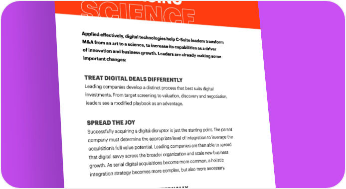 AN EMERGING Applied effectively, digital technologies help C-Suite leaders transform M&A from an art to a science, to increase its capabilities as a driver of innovation and business growth. Leaders are already making some important changes: TREAT DIGITAL DEALS DIFFERENTLY Leading companies develop a distinct process that best suits digital investments. From target screening to valuation, discovery and negotiation, leaders see a modified playbook as an advantage. SPREAD THE JOY Successfully acquiring a digital disruptor is just the starting point. The parent company must determine the appropriate level of integration to leverage the acquisition’s full value potential. Leading companies are then able to spread that digital savvy across the broader organization and scale new business growth. As serial digital acquisitions become more common, a holistic integration strategy becomes more complex, but also more necessary. GREENLIGHT DIGITAL INTERNALLY Forward-thinking companies leverage analytics and applied intelligence to vastly improve their end-to-end capabilities for all acquisitions—traditional and digital. This allows them to generate better insights faster, run a smoother process and extract more value from their M&A. 14 | M&A: FROM ART TO SCIENCE