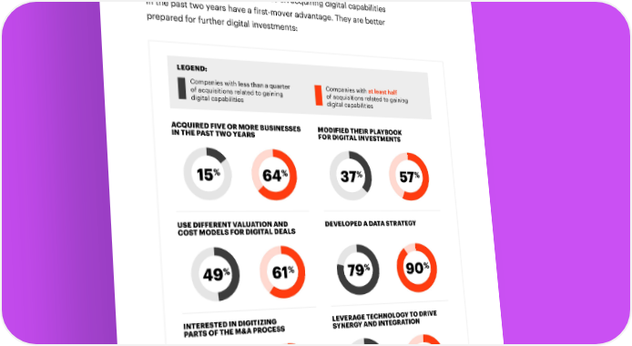 FIGURE 3: EXPERIENCE COUNTS Companies that had a strong focus on acquiring digital capabilities in the past two years have a first-mover advantage. They are better prepared for further digital investments: LEGEND: Companies with less than a quarter Companies with at least half of acquisitions related to gaining of acquisitions related to gaining digital capabilities digital capabilities ACQUIRED FIVE OR MORE BUSINESSES MODIFIED THEIR PLAYBOOK IN THE PAST TWO YEARS FOR DIGITAL INVESTMENTS % % % 57% 15 64 37 USE DIFFERENT VALUATION AND DEVELOPED A DATA STRATEGY COST MODELS FOR DIGITAL DEALS % % % % 49 61 79 90 INTERESTED IN DIGITIZING LEVERAGE TECHNOLOGY TO DRIVE PARTS OF THE M&A PROCESS SYNERGY AND INTEGRATION 80% 89% 51% 61% 10 | M&A: FROM ART TO SCIENCE