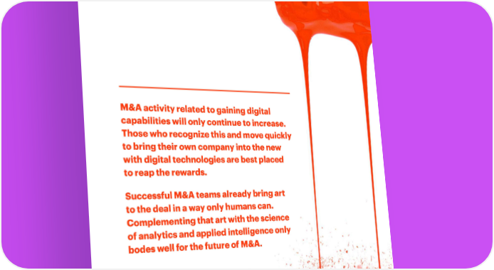 M&A activity related to gaining digital capabilities will only continue to increase. Those who recognize this and move quickly to bring their own company into the new with digital technologies are best placed to reap the rewards. Successful M&A teams already bring art to the deal in a way only humans can. Complementing that art with the science of analytics and applied intelligence only bodes well for the future of M&A. 15 | M&A: FROM ART TO SCIENCE