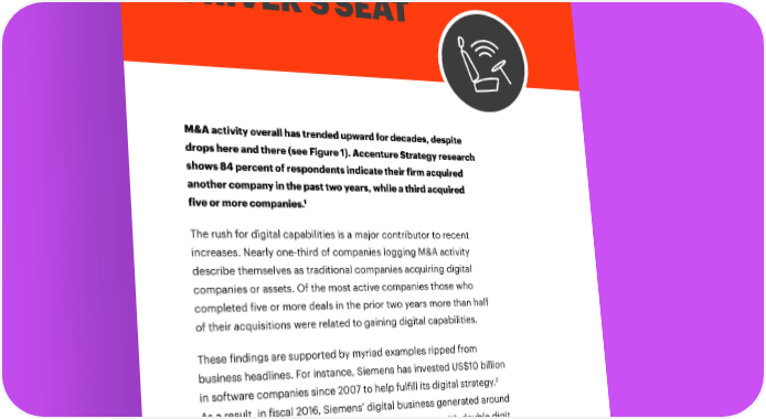 DIGITAL IS IN THE DRIVER’S SEAT M&A activity overall has trended upward for decades, despite drops here and there (see Figure 1). Accenture Strategy research shows 84 percent of respondents indicate their firm acquired another company in the past two years, while a third acquired 1 five or more companies. The rush for digital capabilities is a major contributor to recent increases. Nearly one-third of companies logging M&A activity describe themselves as traditional companies acquiring digital companies or assets. Of the most active companies those who completed five or more deals in the prior two years more than half of their acquisitions were related to gaining digital capabilities. These findings are supported by myriad examples ripped from business headlines. For instance, Siemens has invested US$10 billion 2 in software companies since 2007 to help fulfill its digital strategy. As a result, in fiscal 2016, Siemens’ digital business generated around US$4.6 billion, 12 percent more than the prior year—with double digit 3 growth predicted through 2020. 4 | M&A: FROM ART TO SCIENCE