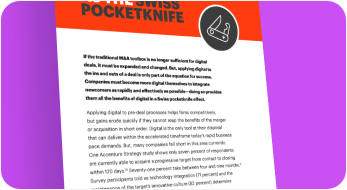 INTERNAL DIGITAL CAPABILITIES AS THE SWISS POCKETKNIFE If the traditional M&A toolbox is no longer sufficient for digital deals, it must be expanded and changed. But, applying digital to the ins and outs of a deal is only part of the equation for success. Companies must become more digital themselves to integrate newcomers as rapidly and effectively as possible—doing so provides them all the benefits of digital in a Swiss pocketknife effect. Applying digital to pre-deal processes helps firms competitively, but gains erode quickly if they cannot reap the benefits of the merger or acquisition in short order. Digital is the only tool at their disposal that can deliver within the accelerated timeframe today’s rapid business pace demands. But, many companies fall short in this area currently. One Accenture Strategy study shows only seven percent of respondents are currently able to acquire a progressive target from contact to closing 10 11 within 120 days. Seventy-one percent take between four and nine months. Survey participants told us technology integration (71 percent) and the maintenance of the target’s innovative culture (62 percent) determine the success of progressive company acquisitions. 12 | M&A: FROM ART TO SCIENCE