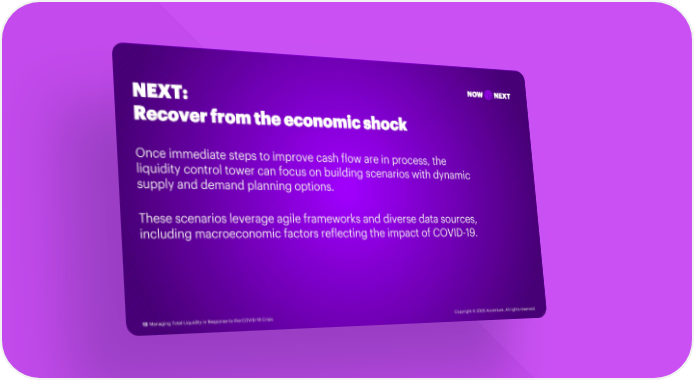 NEXT: NOW NEXT Recover from the economic shock Once immediate steps to improve cash flow are in process, the liquidity control tower can focus on building scenarios with dynamic supply and demand planning options. These scenarios leverage agile frameworks and diverse data sources, including macroeconomic factors reflecting the impact of COVID-19. 12 Managing Total Liquidity in Response to the COVID-19 Crisis Copyright © 2020 Accenture. All rights reserved.
