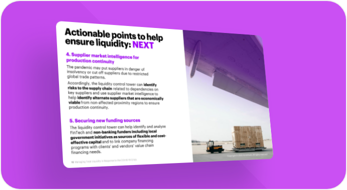 Actionable points to help ensure liquidity: NEXT 4. Supplier market intelligence for production continuity The pandemic may put suppliers in danger of insolvency or cut off suppliers due to restricted global trade patterns. Accordingly, the liquidity control tower can identify risks to the supply chain related to dependencies on key suppliers and use supplier market intelligence to help identify alternate suppliers that are economically viable from non-affected proximity regions to ensure production continuity. 5. Securing new funding sources The liquidity control tower can help identify and analyze FinTech and non-banking funders including local government initiatives as sources of flexible and cost- effective capital and to link company financing programs with clients’ and vendors’ value chain financing needs. 16 Managing Total Liquidity in Response to the COVID-19 Crisis Copyright © 2020 Accenture. All rights reserved.