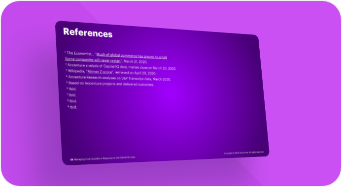 References 1 The Economist, , “Much of global commerce has ground to a halt Some companies will never restart”, March 21, 2020. 2 Accenture analysis of Capital IQ data, market close on March 20, 2020. 3 Wikipedia, "Altman Z-score", retrieved on April 20, 2020. 4 Accenture Research analyses on S&P Transcript data, March 2020. 5 Based on Accenture projects and delivered outcomes. 6 Ibid. 7 Ibid. 8 Ibid. 9 Ibid. 24 Managing Total Liquidity in Response to the COVID-19 Crisis Copyright © 2020 Accenture. All rights reserved.