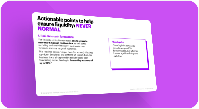 Actionable points to help ensure liquidity: NEVER NORMAL 1. Real-time cash forecasting The liquidity control tower needs online access to Case in point near-real-time cash position data, as well as the Global logistics companies modeling and analytical ability to simulate cash can achieve up to 95% forecasts across a range of scenarios. forecasting accuracy which in This requires constant input from Corporate (reflecting turn can significantly improve top-down decisions) and bottoms-up realism from the cash flow. business lines, all captured in a driver-based cash forecasting model, leading to forecasting accuracy of up to 95%.9 18 Managing Total Liquidity in Response to the COVID-19 Crisis Copyright © 2020 Accenture. All rights reserved.