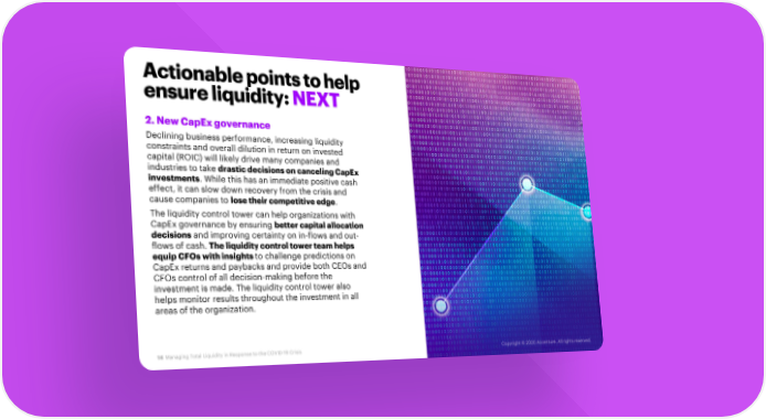 Actionable points to help ensure liquidity: NEXT 2. New CapExgovernance Declining business performance, increasing liquidity constraints and overall dilution in return on invested capital (ROIC) will likely drive many companies and industries to take drastic decisions on canceling CapEx investments. While this has an immediate positive cash effect, it can slow down recovery from the crisis and cause companies to lose their competitive edge. The liquidity control tower can help organizations with CapExgovernance by ensuring better capital allocation decisions and improving certainty on in-flows and out- flows of cash. The liquidity control tower team helps equip CFOs with insights to challenge predictions on CapExreturns and paybacks and provide both CEOs and CFOs control of all decision-making before the investment is made. The liquidity control tower also helps monitor results throughout the investment in all areas of the organization. 14 Managing Total Liquidity in Response to the COVID-19 Crisis