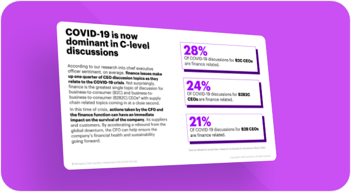 COVID-19 is now dominant in C-level 28% discussions Of COVID-19 discussions for B2C CEOs are finance related. According to our research into chief executive officer sentiment, on average, finance issues make up one quarter of CEO discussion topics as they relate to the COVID-19 crisis. Not surprisingly, 24% finance is the greatest single topic of discussion for business-to-consumer (B2C) and business-to- Of COVID-19 discussions for B2B2C business-to-consumer (B2B2C) CEOs4 with supply CEOs are finance related. chain related topics coming in at a close second. In this time of crisis, actions taken by the CFO and the finance function can have an immediate impact on the survival of the company, its suppliers and customers. By accelerating a rebound from the 21% global downturn, the CFO can help ensure the Of COVID-19 discussions for B2B CEOs company’s financial health and sustainability are finance related. going forward. Source: Based on proprietary research conducted by Accenture, March 2020. 5 Managing Total Liquidity in Response to the COVID-19 Crisis Copyright © 2020 Accenture. All rights reserved.