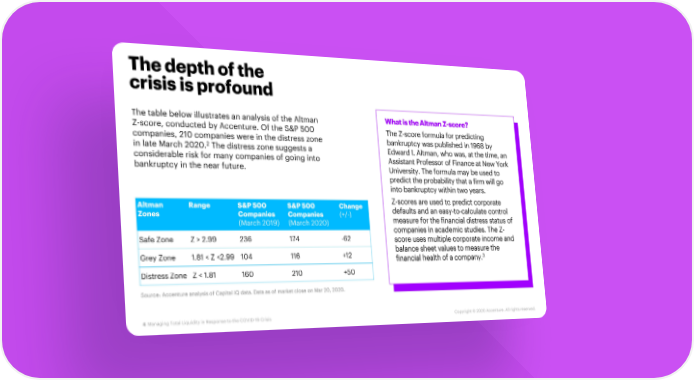 The depth of the crisis is profound The table below illustrates an analysis of the Altman What is the Altman Z-score? Z-score, conducted by Accenture. Of the S&P 500 The Z-score formula for predicting companies, 210 companies were in the distress zone bankruptcy was published in 1968 by in late March 2020.2 The distress zone suggests a Edward I. Altman, who was, at the time, an considerable risk for many companies of going into Assistant Professor of Finance at New York bankruptcy in the near future. University. The formula may be used to predict the probability that a firm will go into bankruptcy within two years. Altman Range S&P 500 S&P 500 Change Z-scores are used to predict corporate Zones Companies Companies (+/-) defaults and an easy-to-calculate control (March 2019) (March 2020) measure for the financial distress status of companies in academic studies. The Z- Safe Zone Z > 2.99 236 174 -62 score uses multiple corporate income and Grey Zone 1.81 < Z <2.99 104 116 +12 balance sheet values to measure the 3 financial health of a company. Distress Zone Z < 1.81 160 210 +50 Source: Accenture analysis of Capital IQ data. Data as of market close on Mar 20, 2020. 4 Managing Total Liquidity in Response to the COVID-19 Crisis Copyright © 2020 Accenture. All rights reserved.