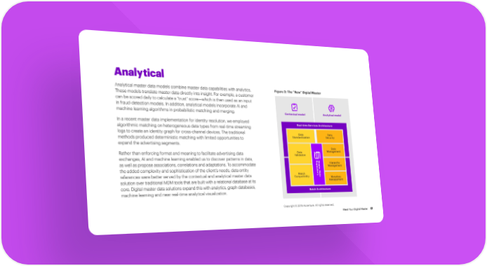 Analytical Analytical master data models combine master data capabilities with analytics. Figure 3: The “New” Digital Master These models translate master data directly into insight. For example, a customer can be scored daily to calculate a “trust” score —which is then used as an input in fraud-detection models. In addition, analytical models incorporate AI and machine learning algorithms in probabilistic matching and merging. Contextual model Analytical model In a recent master data implementation for identity resolution, we employed Real-time Services Architecture algorithmic matching on heterogeneous data types from real-time streaming logs to create an identity graph for cross-channel devices. The traditional Data Data methods produced deterministic matching with limited opportunities to Standardization Security expand the advertising segments. Data Rather than enforcing format and meaning to facilitate advertising data Data Management Validation exchanges, AI and machine learning enabled us to discover patterns in data, ReM as well as propose associations, correlations and adaptations. To accommodate p as Hierarchy o t Management s er i the added complexity and sophistication of the client’s needs, data entity to Da r Match y t references were better served by the contextual and analytical master data Compatibility a Metadata solution over traditional MDM tools that are built with a relational database at its Management core. Digital master data solutions expand this with analytics, graph databases, machine learning and near real-time analytical visualization. Batch Architecture Copyright © 2019 Accenture. All rights reserved. Meet Your Digital Master 17