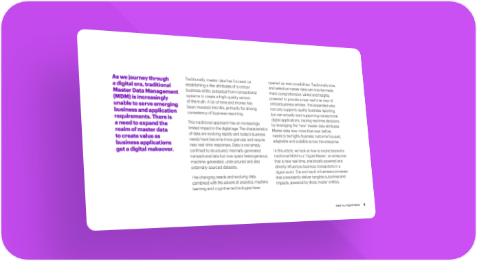 As we journey through Traditionally, master data has focused on opened up new possibilities. Traditionally slow a digital era, traditional establishing a few attributes of a critical and selective master data can now be made Master Data Management business entity extracted from transactional more comprehensive, varied and insights- (MDM) is increasingly systems to create a high-quality version powered to provide a near real-time view of unable to serve emerging of the truth. A lot of time and money has critical business entities. This expanded view business and application been invested into this, primarily for driving not only supports quality business reporting requirements. There is consistency of business reporting. but can actually start supporting transactional digital applications, making real-time decisions a need to expand the This traditional approach has an increasingly by leveraging the “new” master data attributes. realm of master data limited impact in the digital age. The characteristics Master data now, more than ever before, to create value as of data are evolving rapidly and today’s business needs to be highly business outcome focused, business applications needs have become more granular and require adaptable and scalable across the enterprise. get a digital makeover. near real-time responses. Data is not simply confined to structured, internally-generated In this article, we look at how to evolve beyond a transactional data but now spans heterogeneous, traditional MDM to a “Digital Master”, an enterprise machine-generated, unstructured and also that is near real-time, analytically-powered and externally-sourced datasets. directly influences business transactions in a digital world. The end result is business processes The changing needs and evolving data, that consistently deliver tangible outcomes and combined with the advent of analytics, machine impacts, powered by these master entities. learning and cognitive technologies have Meet Your Digital Master 2