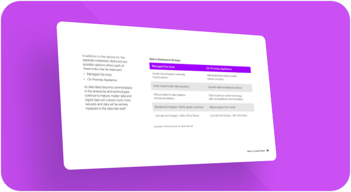 In addition to the options for the Table 2: Deployment Strategy separate containers, there are two possible options where each of Managed Services On-Premise Appliance these hubs may be deployed: • Managed Services Usually cloud-based or externally Well-established traditional MDM hosted solution solution providers • On-Premise Appliance As data lakes become commonplace Graph-based master data repository Typically relational database solutions in the enterprise and technologies APIs provided for data ingestion Tight coupling to vendor technology continue to mature, master data and and service delivery stack and appliance recommendation digital data will coexist much more naturally and data will be entirely Big data technologies—NoSQL (graph, columnar) Mature support from vendor mastered in the data lake itself. Example technologies—Reltio, Pitney Bowes Example technologies—IBM, Informatica Copyright © 2019 Accenture. All rights reserved. Meet Your Digital Master 35