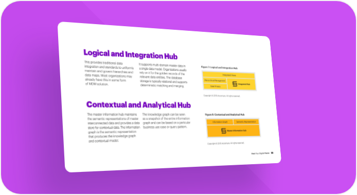 Logical and Integration Hub This provides traditional data It supports multi-domain master data in Figure 7: Logical and Integration Hub integration and standards to uniformly a single data model. Organizations usually maintain and govern hierarchies and rely on it for the golden records of the Integrated Views data maps. Most organizations may relevant data entities. The database Hierarchical Management already have this in some form storage is typically relational and supports Integrated Hub of MDM solution. deterministic matching and merging. Data Privacy Copyright © 2019 Accenture. All rights reserved. Contextual and Analytical Hub The master information hub maintains The knowledge graph can be seen Figure 8: Contextual and Analytical Hub the semantic representations of master as a snapshot of the entire information interconnected data and provides a data graph and can be based on a particular Information Graph Semantic Representation store for contextual data. The information business use case or query pattern. graph is the semantic representation Master Information Hub that produces the knowledge graph and contextual model. Copyright © 2019 Accenture. All rights reserved. Meet Your Digital Master 26