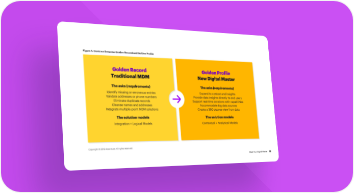 Figure 1: Contrast Between Golden Record and Golden Profile Golden Record Golden Profile Traditional MDM New Digital Master The asks (requirements) The asks (requirements) Identify missing or erroneous entries Expand to context and insights Validate addresses or phone numbers Provide data insights directly to end users Eliminate duplicate records Support real-time solutions with capabilities Cleanse names and addresses Accommodate big data sources Integrate multiple-point MDM solutions Create a 360-degree view from data The solution models The solution models Integration + Logical Models Contextual + Analytical Models Copyright © 2019 Accenture. All rights reserved. Meet Your Digital Master 12