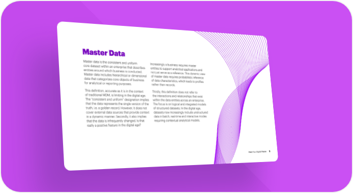 Master Data Master data is the consistent and uniform Increasingly a business requires master core dataset within an enterprise that describes entities to support analytical applications and entities around which business is conducted. not just serve as a reference. This dynamic view Master data includes hierarchical or dimensional of master data requires probabilistic inference data that categorizes core objects of business of data characteristics, which leads to profiles for analytical or reporting purposes. rather than records. This definition, accurate as it is in the context Thirdly, this definition does not refer to of traditional MDM, is limiting in the digital age. the interactions and relationships that exist The “consistent and uniform” designation implies within the data entities across an enterprise. that the data represents the single version of the The focus is on logical and integrated models truth, i.e. a golden record. However, it does not of structured datasets. In the digital age, cover external data sources that provide context datasets now increasingly include unstructured in a dynamic manner. Secondly, it also implies data in batch, real-time and interactive modes that the data is infrequently changed. Is that requiring contextual analytical models. really a positive feature in the digital age? Meet Your Digital Master 5