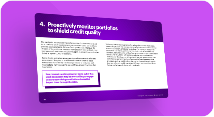 4. Proactively monitor portfolios to shield credit quality The pandemic has exposed major shortcomings in the access to short- With many banks relaxing credit policy substantially to issue credit faster, term credit for small business customers as many banks are unable to tomorrow’s problem may become higher default rates and the need for more process applications and disburse funds quickly. And whenever the intensive collections processes. Banks should be looking to protect both impacts of the crisis start to abate, we expect that small and mid-sized themselves and their customers from the likely credit deterioration and, businesses will need more long-term support to ensure they survive (and ultimately, defaults in what will be a long-term recovery to pre-crisis levels of thrive) in a post-COVID-19 economy. demand. For this, banks will need a coordinated and comprehensive portfolio view that draws on data and analytics tools embedded into their Banks should aspire to make access to credit simpler and adhere to portfolio management functions. Tapping into these data sets to drive government directives to provide credit to small and mid-sized processes, such as credit reviews that can be triggered through specific enterprises more flexibly—and even go further to find ways, both business rules, will enable operational efficiency and the ability to direct financial and non-financial, to support these clients in running their human capital towards higher-value workloads. businesses. New, trusted relationships may come out of it as small businesses may be more willing to engage in more open dialogue with those banks that helped them through the crisis. 15 Copyright © 2020 Accenture. All rights reserved.