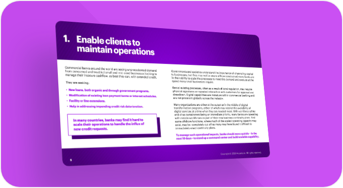 1. Enable clients to maintain operations Commercial banks around the world are seeing unprecedented demand Governments and societies understand the importance of channeling capital from concerned and troubled small and mid-sized businesses looking to to businesses, but they may not be aware of how constrained many banks are manage their insecure cashflow, as best they can, with extended credit. in their ability to scale the processes to meet this demand and execute at the speed many small businesses require. They are seeking: Banks’ existing processes, often as a result of local regulation, may require • New loans, both organic and through government programs. physical signatures or repeated interaction with customers for approval and • Modification of existing loan payment terms or interest schedules. drawdown. Digital capabilities are immature within commercial banking and are not prevalent globally across the industry. • Facility or line extensions. • Help in addressing impending credit risk deterioration. Many organizations are either at the outset or in the middle of digital transformation programs, either of which may restrict the availability of digital services at a time when they are needed most. With workforce safety and virus containment being an immediate priority, many banks are operating In many countries, banks mayfind it hard to with remote workforces as part of their new business continuity plans. And scale their operations to handle the influx of some offshore functions, where much of the scaled operating capacity may new credit requests. exist, may be completely cut off as many may have found it difficult to immediately enact continuity plans. To manage such operational impacts, banks should move quickly—in the next 10 days—to stand up a command center and build scalable capability. 5 Copyright © 2020 Accenture. All rights reserved.