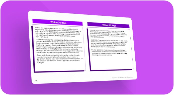 Within 30 days Within 60 days Partner with organizations that can help deliver rapid digital credit Integrate tactical commercial digital engagement solutions into origination at scale. Software providers can help banks quickly stand up the broader IT stack as solutions come on stream and immediate ready-to-go, out-of-the-box solutions to meet market demand quickly demand becomes manageable. This can help a bank to address both with minimum barriers to entry. Technology firms that are well-versed temporary and longer-term needs, while maintaining a digitally- and experienced in specific technology solutions can enable decoupled architecture. rapid deployment. Extend your existing retail banking digital offering infrastructure to Establish the future state of tactical solutions. This will entail deciding commercial customers to provide very basic and minimal self-servicing whether to improve, keep, or remove any of the resources, process, functions, enabling more autonomy and reducing menial tasks for and technology changes implemented in response to the health relationship managers. This includes duties like viewing balances, crisis. Consider how these changes may be integrated into the categorizing transactions, making payment notifications, and analyzing broader picture once the pandemic passes. cashflow. Doing so will help lighten the workload on relationship Develop appropriate change materials for broader rollout and managers and contact centersthat are being bogged down in the crisis adoption outside of the cross-functional center of excellence and with a flood of requests from large and small business customers. optimize value by determining how the wider audience can adopt Create tactical commercial digital offerings that can handle credit this change into everyday business. requests, focusing primarily on the products that are backed by government stimulus plans and electronic document management. This will help ease the interaction between applicants and relationship managers. 14 Copyright © 2020 Accenture. All rights reserved.