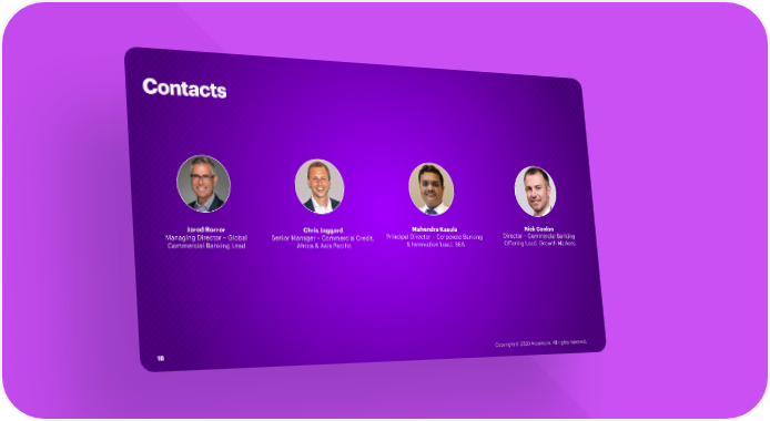 Contacts Jared Rorrer Chris Jaggard MahendraKasula Nick Conlon Managing Director – Global Senior Manager – Commercial Credit, Principal Director – Corporate Banking Director – Commercial Banking Commercial Banking Lead Africa & Asia Pacific & Innovation Lead, SEA Offering Lead, Growth Markets 18 Copyright © 2020 Accenture. All rights reserved.
