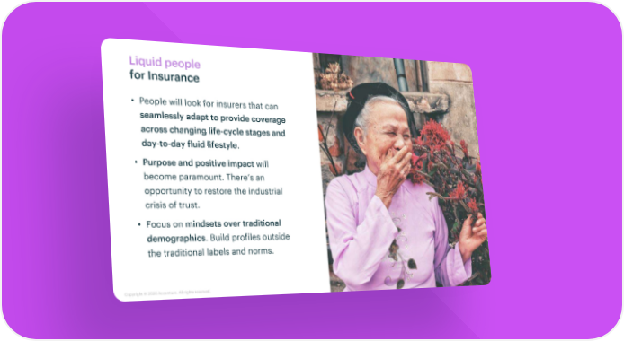 Liquid people for Insurance • People will look for insurers that can seamlessly adapt to provide coverage across changing life-cycle stages and day-to-day fluid lifestyle. • Purpose and positive impact will become paramount. There’s an opportunity to restore the industrial crisis of trust. • Focus on mindsets over traditional demographics. Build profiles outside the traditional labels and norms. Copyright © 2020 Accenture. All rightsreserved.