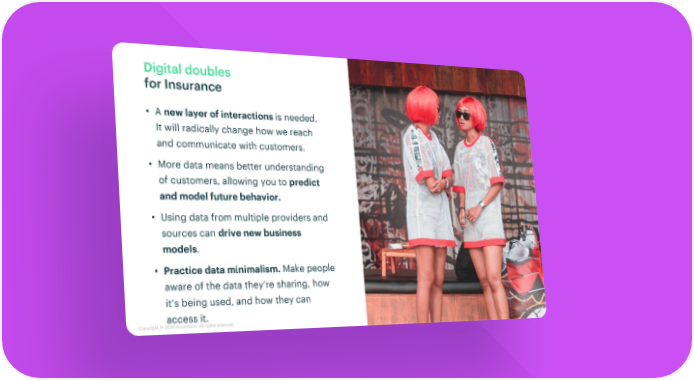 Digital doubles for Insurance • A new layer of interactions is needed. It will radically change how we reach and communicate with customers. • More data means better understanding of customers, allowing you to predict and model future behavior. • Using data from multiple providers and sources can drive new business models. • Practice data minimalism. Make people aware of the data they’re sharing, how it’s being used, and how they can access it. Copyright © 2020 Accenture. All rightsreserved.