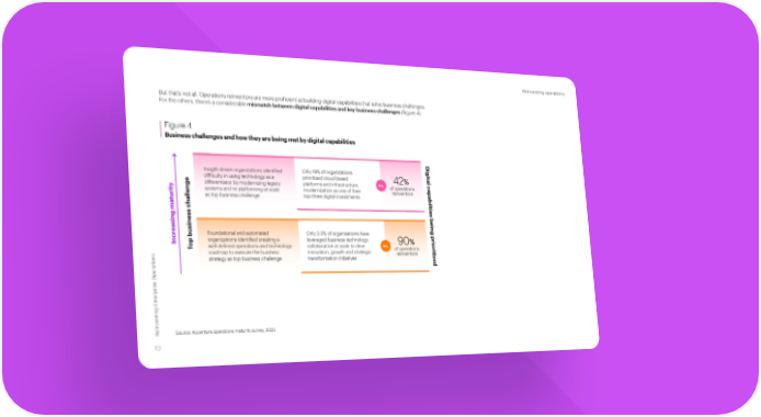Reinventing operations But that’s not all. Operations reinventors are more proficient at building digital capabilities that solve business challenges. For the others, there’s a considerable mismatch between digital capabilities and key business challenges (Figure 4). Figure 4 Business challenges and how they are being met by digital capabilities Digit Insight-driven organizations identified Only 19% of organizations difficulty in using technology as a prioritized cloud-based vs. 42% al capabiltie differentiator by modernizing legacy platforms and infrastructure of operations systems and re-platforming at scale modernization as one of their reinventors as top business challenge top three digital investments ss challenge s being prioritiz asing maturity e Foundational and automated Only 2-3% of organizations have Incr op busineorganizations identified creating a leveraged business-technology 90% T well-defined operations and technology collaboration at scale to drive vs. of operations roadmap to execute the business innovation, growth and strategic reinventors ations strategy as top business challenge transformation initiatives ed enting Enterprise Oper v ein Source: Accenture operations maturity survey, 2023 R 12