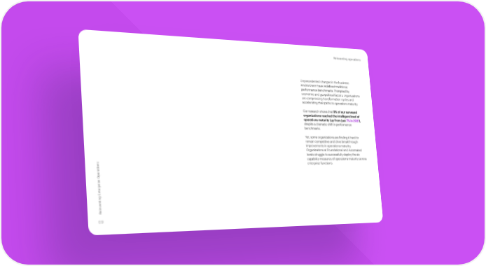 Reinventing operations Unprecedented changes in the business vironment have redefined traditional en performance benchmarks. Prompted by economic and geopolitical factors, organizations are compressing transformation cycles and accelerating their paths to operations maturity. Our research shows that 9% of our surveyed organizations reached the intelligent level of operations maturity (up from just 7% in 2021), despite a dramatic shift in performance benchmarks. Yet, some organizations are finding it hard to remain competitive and drive breakthrough improvements in operations maturity. Organizations at Foundational and Automated levels struggle to successfully deploy the six capability measures of operations maturity across enterprise functions. ations enting Enterprise Oper v ein R 09