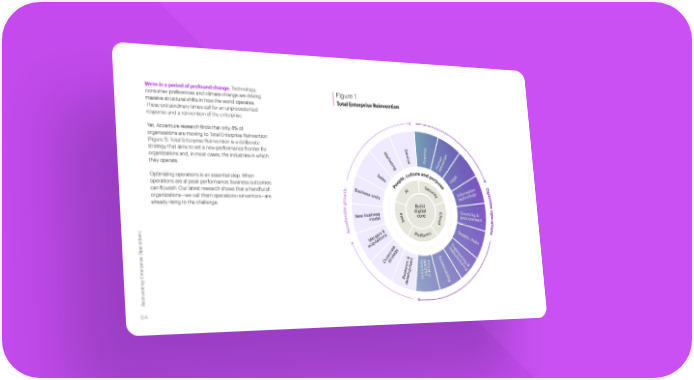 We’re in a period of profound change. Technology, Figure 1 consumer preferences and climate change are driving Total Enterprise Reinvention massive structural shifts in how the world operates. These extraordinary times call for an unprecedented response and a reinvention of the enterprise. Yet, Accenture research finds that only 8% of organizations are moving to Total Enterprise Reinvention (Figure 1). Total Enterprise Reinvention is a deliberate Ser strategy that aims to set a new performance frontier for Mark vice s organizations and, in most cases, the industries in which eting inance ce they operate. F sour Human e e r ltur an Sale cu d p Optimizing operations is an essential step. When s le, urp egal op o L operations are at peak performance, business outcomes e S se O P e Busine I c p can flourish. Our latest research shows that a handful of h u t A r t i ss units t ormation i organizations—we call them operations reinventors—are w y Inf m o technology i already rising to the challenge. r z g e Build e C o ta digital Sour p r w business at core ol cing & e Ne a u pr r e ocur l model D d ement a ec oit cA P S sn s & latforms upply chain ger ations Mer Engineering & acquisitions manuf ate ategy S acturing str functionsspecific Industr ust Corpor ch & ainability ar ese elopment y R v enting Enterprise Oper de v ein R 04