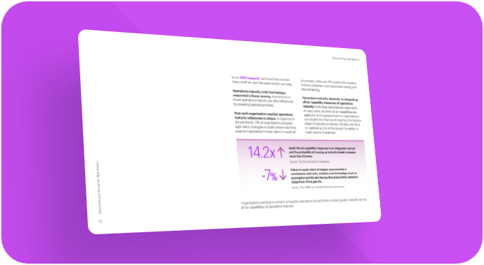 Reinventing operations In our 2021 research, we found that one size processes), while only 11% scaled other leading does not fit all—and the same holds true today. industry practices, such as process mining and benchmarking. Operations maturity is far from being a sequential or linear journey. Investments to Operations maturity depends on integrating boost operations maturity are often influenced all six capability measures of operations by pressing business priorities. maturity. Individual maturities are dependent on each other, so when all six capabilities are How each organization reaches operations applied in an integrated manner, organizations maturity milestones is unique. In response to can double the chances of reaching the highest the pandemic, 21% of organizations adopted stage of operations maturity. Similarly, fall short agile talent strategies at scale (where machines on optimizing one of the six and the ability to augment specialized human talent in nearly all scale value is threatened. Apply the six capability measures in an integrated manner and the probability of moving up maturity levels increases 14.2X more than 14 times. Source: The Value Multiplier | Accenture ations Failure to apply talent strategies appropriately in combination with data, analytics and technology (such as -7% automation and AI) and the top-line productivity premium drops from 11% to just 4%. Source: The CHRO as a Growth Executive | Accenture enting Enterprise Oper v Organizations seeking to reinvent enterprise operations should strive to drive greater maturity across ein all six capabilities of operations maturity. R 10