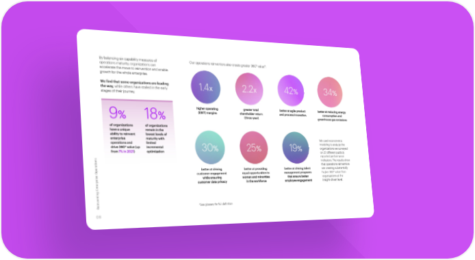 By balancing six capability measures of Our operations reinventors also create greater 360° value*: operations maturity, organizations can accelerate the move to reinvention and enable growth for the whole enterprise. We find that some organizations are leading 1.4x 2.2x 42% 34% the way, while others have stalled in the early stages of their journey. higher operating greater total better at agile product better at reducing energy (EBIT) margins shareholder return and process innovation consumption and 9% 18% (three-year) greenhouse gas emissions of organizations of organizations have a unique remain in the ability to reinvent lowest levels of enterprise maturity with We used econometric operations and limited modeling to analyze the drive 360° value (up incremental 30% 25% 19% organizations we surveyed from 7% in 2021) optimization on 22 different publicly reported performance indicators. The results show ations that operations reinventors better at driving better at providing better at driving talent are creating substantially customer engagement equal opportunities to management programs higher 360° value than while ensuring women and minorities that ensure better organizations at the customer data privacy in the workforce employee engagement insight-driven level. enting Enterprise Oper v ein *See glossary for full definition R 06