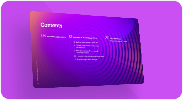 Contents 08Reinventing operations 13 Five ways to reinvent operations 30 How to access a new performance frontier 15 Seek out 360° value as a North Star 18 Commit to data decisiveness across the enterprise 21 Innovate processes for enhanced performance gains 24 Humanize automation experiences at scale 27 Employ an agile talent strategy ations enting Enterprise Oper v ein R 03