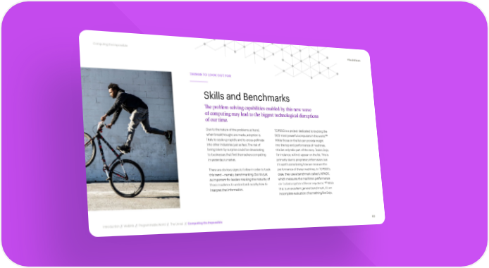 Computing the Impossible #TechVision THINGS TO LOOK OUT FOR Skills and Benchmarks The problem-solving capabilities enabled by this new wave of computing may lead to the biggest technological disruptions of our time. Due to the nature of the problems at hand, TOP500 is a project dedicated to tracking the 186 when breakthroughs are made, adoption is 500 most powerful computers in the world. likely to scale up rapidly and to cross-pollinate While those on the list can provide insight into other industries just as fast. The risk of into the top end performance of machines, being taken by surprise could be devastating this list only tells part of the story. Tesla’s Dojo, to businesses that find themselves competing for instance, will not appear on the list. This is in yesterday’s market. primarily due to proprietary information, but it’s worth considering how we measure the There are obvious signs to follow in order to track performance of these machines. In TOP500’s this trend – namely, benchmarking. But it’s just case, they use a benchmark called LINPACK, as important for leaders tracking the maturity of which measures the machine’s performance 187 these machines to understand exactly how to on “a dense system of linear equations.” While interpret that information. that is an excellent general benchmark, it’s an incomplete evaluation of something like Dojo, Introduction // WebMe // Programmable World // The Unreal // Computing the Impossible 83