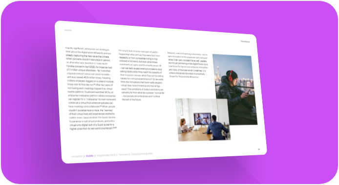 WebMe #TechVision Equally significant, enterprises are starting to It’s easy to look at some examples of what’s However, a word of warning is necessary. Just as think about the digital world differently and are happening today and say they were born from early innovation in this space can carry outsized already capturing the new value that’s there. necessity or from companies trying to hop value, it can carry outsized risk as well. Leaders When concerts couldn’t take place in person, onboard a hot trend. But even when these are not just pioneering a new digital future, but a an alternative was invented. A Travis Scott constraints are gone and the novelty wears off new future for human and enterprise interaction, Fortnite concert in April 2020, for instance, had – can we really expect event promoters to stop and many of the rules remain undefined. It is 27.7 million unique attendees – far more than selling tickets when they reach the capacity of critical enterprises take steps to proactively a typical concert venue can accommodate – their in-person venues, when they can be selling shape the “Responsible Metaverse.” and was viewed 45.8 million times, meaning tickets for a virtual experience too? Do we really millions of players logged on to attend multiple think the innovations that have made people’s 62 times over its five-day run. After two years of virtual lives more immersive and real will go not having work meetings happen live, virtual away? The conditions of today’s evolutions are events platform Touchcast launched MCity, an certainly far from what we consider “normal life” enterprise metaverse platform where companies – but people and enterprises won’t unhear can register for a “.metaverse” domain name and the bell of the future. construct a virtual hub where employees can 63 have meetings and collaborate. When people couldn’t socialize face-to-face, the “realness” of their virtual lives and experiences started to matter more. Gucci created The Gucci Garden Experience to sell virtual products, and sold a virtual-only digital twin of a Gucci purse for a 64,65 higher price than its real-world counterpart. Introduction // WebMe // Programmable World // The Unreal // Computing the Impossible 34