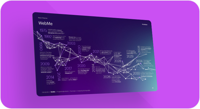 Trend 1 Timeline #TechVision WebMe VIDEOPLACE is released 1975 and is considered the first interactive VR experience.20 Neal Stephenson coins Second Life is formed 1992 the metaverse in hit and attracts one million novel Snow Crash.22 23 active users by 2013. 19 2003 Travis Scott hosts European Commission 9 a concert inside classifies new category 0 20Fortnite for 27.7 031of workers who spend U.S. libraries begin 100% of time in 29 NFT by artist Beeple sells million fans. 2021for 69.3 million dollars A major fashion to install public-use 2 metaverse workspace. Ultima VI: The False 30 retailer’s NFT virtual reality devices. Prophet introduces 20 at Christie’s auction. products begin immersive sim gaming to outsell its 2029 (a precursor to the physical goods. metaverse).21 The average adult 2028 2034 spends equal amounts of time 2009 in immersive virtual Bitcoin is released, 2020 24Plans are worlds as the real one. jumping in value from 2017 The average American 0 announced for first less than 1 cent to adult increases their blockchain-based 24 Microsoft acquires $47,000 in 2021. 2 time online 25% to 2 international trade AltspaceVR.27 28 agreement. In China, common items 0 16 hours a day. 2030like deeds, driver’s licenses, 2014 14 To combat rising and birth certificates are Gavin Wood – co founder of 2026 costs and increase certified on a blockchain. 26 Facebook Ethereum – defines Web3. access, a public buys Oculus university system 25 opens VR campus. for $2 billion. Introduction // WebMe // Programmable World // The Unreal // Computing the Impossible 22