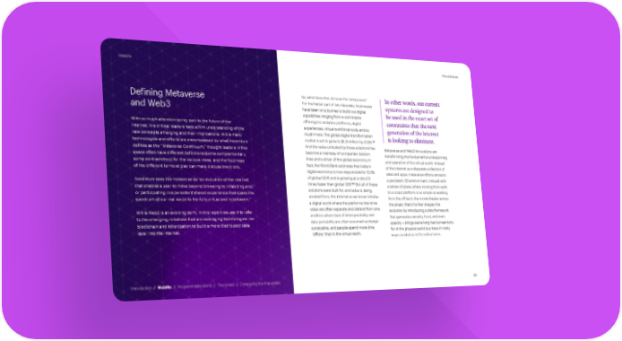 WebMe #TechVision Defining Metaverse So, what does this all mean for enterprises? In other words, our current For the better part of two decades, businesses systems are designed to and Web3 have been on a journey to build out digital be used in the exact set of capabilities ranging from e-commerce With so much attention being paid to the future of the offerings to analytics platforms, digital constraints that the next internet, it is critical leaders have a firm understanding of the experiences, virtual workforce tools, and so generation of the internet new concepts emerging and their implications. While many much more. The global digital transformation is looking to eliminate. 39 technologies and efforts are encompassed by what Accenture market is set to grow to $1.25 trillion by 2026. defines as the “Metaverse Continuum,” thought leaders in this And the value unlocked by these solutions has Metaverse and Web3 innovations are space often have different definitions (some complementary, become a mainstay of companies’ bottom transforming the fundamental underpinning some contradictory) for the various ideas, and the fuzziness lines and a driver of the global economy. In and operation of the virtual world. Instead of the different terms at play can make discussions tricky. fact, the World Bank estimates that today’s of the internet as a disparate collection of digital economy is now responsible for 15.5% sites and apps, metaverse efforts envision Accenture sees the metaverse as “an evolution of the internet of global GDP, and is growing at a rate 2.5 a persistent 3D environment, imbued with 40 that enables a user to move beyond browsing to inhabiting and/ times faster than global GDP. But all of these a sense of place, where moving from work or participating in a persistent shared experience that spans the solutions were built for, and value is being to a social platform is as simple as walking spectrum of our real world to the fully virtual and in between.” created from, the internet as we know it today: from the office to the movie theater across a digital world where the platforms that drive the street. Web3 further shapes this While Web3 is an evolving term, in this report we use it to refer value are often separate and distinct from one evolution by introducing a data framework to the emerging initiatives that are leveraging technologies like another, where lack of interoperability and that generates veracity, trust, and even blockchain and tokenization to build a more distributed data data portability are often assumed as design scarcity – things we’ve long had conventions layer into the internet. constraints, and people spend more time for in the physical world but have in many “offline” than in the virtual realm. ways evaded us in the virtual ones. Introduction // WebMe // Programmable World // The Unreal // Computing the Impossible 24