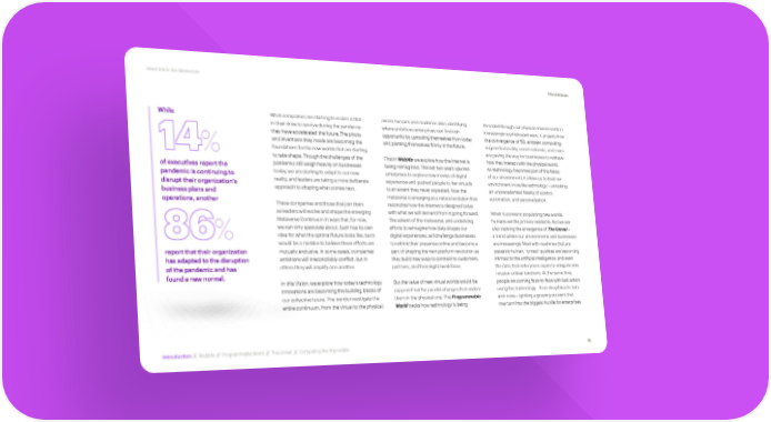 Meet Me in the Metaverse #TechVision While What companies are starting to realize is that across humans and machines alike, identifying threaded through our physical environments in in their drive to survive during the pandemic where ambitious enterprises can find rich increasingly sophisticated ways. It projects how they have accelerated the future. The pivots opportunity by uprooting themselves from today the convergence of 5G, ambient computing, and inventions they made are becoming the and planting themselves firmly in the future. augmented reality, smart materials, and more 14% foundations for the new worlds that are starting are paving the way for businesses to reshape to take shape. Though the challenges of the First in WebMe we explore how the internet is how they interact with the physical world. of executives report the pandemic still weigh heavily on businesses being reimagined. The last two years spurred As technology becomes part of the fabric pandemic is continuing to today, we are starting to adapt to our new enterprises to explore new modes of digital of our environment, it allows us to treat our disrupt their organization’s reality, and leaders are taking a more deliberate experience and pushed people to live virtually environment more like technology – unlocking business plans and approach to shaping what comes next. to an extent they never expected. Now the an unprecedented fidelity of control, operations, another metaverse is emerging as a natural evolution that automation, and personalization. These companies and those that join them reconciles how the internet is designed today as leaders will evolve and shape the emerging with what we will demand from it going forward. When it comes to populating new worlds, Metaverse Continuum in ways that, for now, The advent of the metaverse, and underlying humans are the primary residents. But we are we can only speculate about. Each has its own efforts to reimagine how data shapes our also tracking the emergence of The Unreal – 86% idea for what the optimal future looks like, but it digital experiences, will challenge businesses a trend where our environments and businesses would be a mistake to believe these efforts are to rethink their presence online and become a are increasingly filled with machines that are report that their organization mutually exclusive. In some cases, companies’ part of shaping the next platform revolution as passably human. “Unreal” qualities are becoming has adapted to the disruption ambitions will irreconcilably conflict, but in they build new ways to connect to customers, intrinsic to the artificial intelligence, and even of the pandemic and has others they will amplify one another. partners, and their digital workforce. the data, that enterprises aspire to integrate into found a new normal. mission-critical functions. At the same time, In this Vision, we explore how today’s technology But the value of new virtual worlds would be people are coming face-to-face with bad actors innovations are becoming the building blocks of capped if not for parallel changes that anchor using this technology – from deepfakes to bots our collective future. The trends investigate the them in the physical one. The Programmable and more – igniting a growing concern that entire continuum, from the virtual to the physical, World tracks how technology is being may turn into the biggest hurdle for enterprises Introduction // WebMe // Programmable World // The Unreal // Computing the Impossible 15
