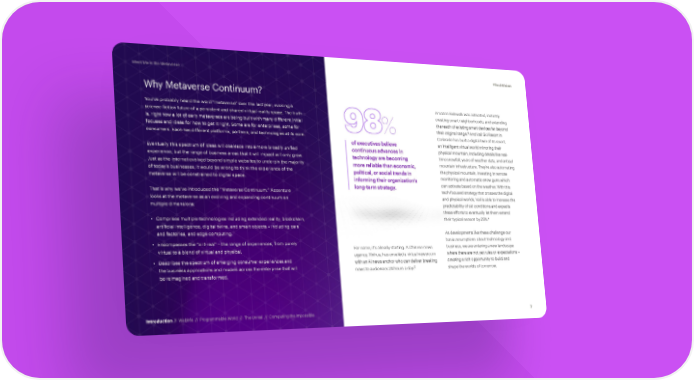 Meet Me in the Metaverse #TechVision Why Metaverse Continuum? You’ve probably heard the word “metaverse” over the last year, evoking a Amazon Sidewalk was activated, instantly science fiction future of a persistent and shared virtual reality space. The truth creating smart neighborhoods, and extending is, right now a lot of early metaverses are being built with many different initial the reach of existing smart devices far beyond 3 focuses and ideas for how to get it right. Some are for enterprises, some for 98% their original range. And Vail Ski Resort in consumers. Each has different platforms, partners, and technologies at its core. Colorado has built a digital twin of its resort, of executives believe an intelligent virtual world mirroring their Eventually this spectrum of ideas will coalesce into a more broadly unified continuous advances in physical mountain, including details like real- experience, but the range of business areas that it will impact will only grow. technology are becoming time snowfall, years of weather data, and critical Just as the internet evolved beyond simple websites to underpin the majority more reliable than economic, mountain infrastructure. They’re also automating of today’s businesses, it would be wrong to think the experience of the political, or social trends in the physical mountain, investing in remote metaverse will be constrained to digital space. informing their organization’s monitoring and automatic snow guns which long-term strategy. can activate based on the weather. With this That is why we’ve introduced the “Metaverse Continuum.” Accenture tech-focused strategy that crosses the digital looks at the metaverse as an evolving and expanding continuum on and physical worlds, Vail is able to increase the multiple dimensions: predictability of ski conditions and expects these efforts to eventually let them extend • Comprises multiple technologies including extended reality, blockchain, their typical season by 25%.4 artificial intelligence, digital twins, and smart objects – including cars and factories, and edge computing. As developments like these challenge our • Encompasses the “virt-real” – the range of experiences, from purely basic assumptions about technology and virtual to a blend of virtual and physical. For some, it’s already starting. A Chinese news business, we are entering a new landscape agency, Xinhua, has unveiled a virtual newsroom where there are not yet rules or expectations – • Describes the spectrum of emerging consumer experiences and with an AI news anchor who can deliver breaking creating a rich opportunity to build and the business applications and models across the enterprise that will 2 shape the worlds of tomorrow. news to audiences 24 hours a day. be reimagined and transformed. Introduction // WebMe // Programmable World // The Unreal // Computing the Impossible 7