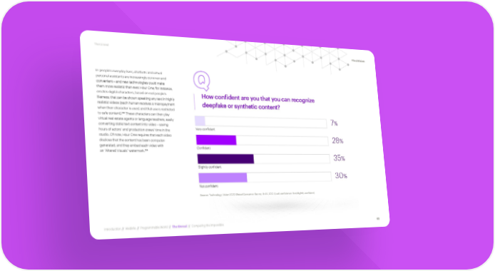 The Unreal #TechVision In people’s everyday lives, chatbots and virtual personal assistants are increasingly common and convenient – and new technologies could make Q them more realistic than ever. Hour One, for instance, creates digital characters, based on real people’s How confident are you that you can recognize likeness, that can be shown speaking any text in highly realistic videos (each human receives a micropayment deepfake or synthetic content? when their character is used, and that use is restricted 133 to safe content). These characters can then play virtual real estate agents or language teachers, easily 7% converting static text content into video – saving hours of actors’ and production crews’ time in the Very confident studio. Of note, Hour One requires that each video 28% disclose that the content has been computer- generated, and they embed each video with Confident 134 an “Altered Visuals” watermark. 35% Slightly confident 30% Not confident Source: Technology Vision 2022 Global Consumer Survey. N=24,000. (Lack confidence: Not/slightly confident) Introduction // WebMe // Programmable World // The Unreal // Computing the Impossible 62