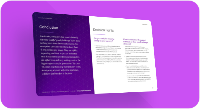 Computing the Impossible #TechVision Conclusion Decision Points: For decades, computers that could efficiently Are you ready for systemic What foundations will you need solve the world’s “grand challenges” have been change in your industry? to rethink as these grand challenges nothing more than theoretical concepts. But are solved? • Prepare to reevaluate your industry’s biggest barriers and • Create a futurist team to game through how new enterprises can’t afford to think about them impossibilities. Imagine how your industry – and enterprise technologies could threaten the status quo of the enterprise. in the abstract any longer. They are rapidly – would fundamentally change if these previously Pick a diverse team – skills, cognitive, gender, race, age, intractable problems could be efficiently solved. ethnicity – and give them space and a mandate to explore improving, and their impact on industries’ • Start making bets on the future of computing. Establish and free think. most fundamental problems and parameters a group for scanning and benchmarking this specifically. • Prepare for the move to quantum safe cryptography. They should meet quarterly or semi-annually to match the Follow the progress and selection of the post-quantum can either be an industry-ending event or the pace of change in your industry. Determine which class encryption methods at standards bodies such as NIST of machines is likely to impact your enterprise the earliest, and ISO. You may be able to protect yourself before the biggest opportunity in generations. The ones and in what way. grand challenges are solved. who start rearchitecting their industry today, • Assess the technical debt your organization carries. What is the innovation interest you are passively incurring anticipating a future with these machines, by holding onto technologies too long? Create a roadmap will have the best shot at the latter. for investment to pay down the technical debt and move to more agile architectures and technologies. • Identify new risks and opportunities these new compute architectures present. How will you test the integrity of the output and protect against poisoning the new capabilities that enable innovative new business models. Introduction // WebMe // Programmable World // The Unreal // Computing the Impossible 87
