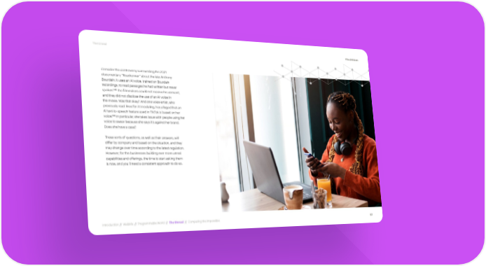 The Unreal #TechVision Consider the controversy surrounding the 2021 documentary “Roadrunner” about the late Anthony Bourdain. It uses an AI voice, trained on Bourdain recordings, to read passages he had written but never 149 spoken. The filmmakers could not receive his consent, and they did not disclose the use of an AI voice in the movie. Was that okay? And one voice artist, who previously read lines for AI modeling, has alleged that an AI text-to-speech feature used in TikTok is based on her 150 voice. In particular, she takes issue with people using her voice to swear because she says it’s against her brand. Does she have a case? These sorts of questions, as well as their answers, will differ by company and based on the situation, and they may change over time according to the latest regulation. However, for the businesses building ever more unreal capabilities and offerings, the time to start asking them is now, and you’ll need a consistent approach to do so. Introduction // WebMe // Programmable World // The Unreal // Computing the Impossible 67