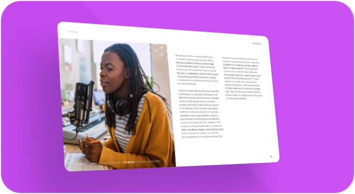 The Unreal #TechVision What departments are using synthetic data Machines creates synthetic people that can or content in the company, and who will be be used in cases where customers might fear held accountable if privacy is compromised judgment from others and actually prefer to 156 or customers feel duped? Finally, who will be speak to digital people. Yumi is one such the point person responsible if your company “autonomously animated digital influencer” falls prey to a deepfake or disinformation attack? that answers customers’ questions about their 157 Having these governance structures in place skin for P&G’s skincare brand SK-II. Yumi’s is imperative to handle the inherent risks baked realness can enable more seamless and into the unreal world. personal interaction – while simultaneously, its digital essence puts customers at greater Last but not least, genuine purpose is essential ease. Here, the purpose of using a synthetic to authenticity. In particular, businesses must person is clear on multiple fronts, and as such, define the purpose behind the use of synthetic is convincingly authentic. content, its advantage over non-synthetic content, and the key metrics that can attest to it. For instance, if your business uses a basic customer service bot simply to cut costs (as opposed to improving availability), there’s a good chance it’s not living up to its intended purpose of serving customers. However, if the purpose of using synthetic data in a model is to insert counterbias, thereby improving the output of the model, then it could be an authentic use of generative AI. As another example, Soul Introduction // WebMe // Programmable World // The Unreal // Computing the Impossible 69