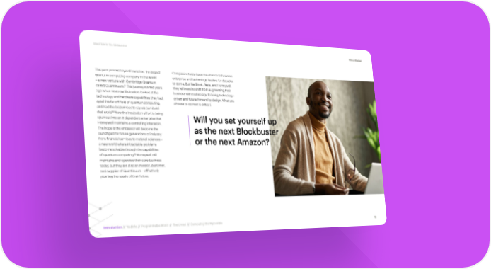Meet Me in the Metaverse #TechVision This past year Honeywell launched the largest Companies today have the chance to become quantum computing company in the world enterprise and technology leaders for decades – a new venture with Cambridge Quantum to come. But like Block, Tesla, and Honeywell, 11 called Quantinuum. This journey started years they will need to shift from augmenting their ago when Honeywell’s leaders looked at the business with technology to being technology- technology and hardware capabilities they had, driven and future-forward by design. What you eyed the far-off field of quantum computing, choose to do next is critical: and had the brazenness to say we can build 12 that world. Now the incubation effort is being spun out into an independent enterprise that Will you set yourself up Honeywell maintains a controlling interest in. The hope is the endeavor will become the as the next Blockbuster launchpad for future generations of industry from financial services to material sciences – or the next Amazon? a new world where intractable problems become solvable through the capabilities 13 of quantum computing. Honeywell still maintains and operates their core business today, but they are also an investor, customer, and supplier of Quantinuum – effectively planting the seeds of their future. Introduction // WebMe // Programmable World // The Unreal // Computing the Impossible 12