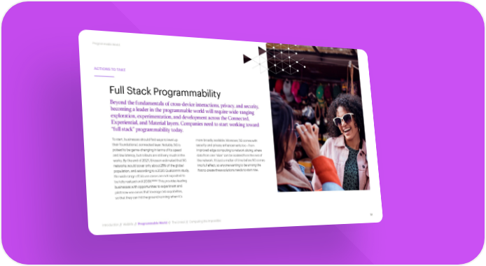 Programmable World ACTIONS TO TAKE Full Stack Programmability Beyond the fundamentals of cross-device interactions, privacy, and security, becoming a leader in the programmable world will require wide-ranging exploration, experimentation, and development across the Connected, Experiential, and Material layers. Companies need to start working toward “full stack” programmability today. To start, businesses should find ways to level up more broadly available. Moreover, 5G comes with their foundational, connected layer. Notably, 5G is security and privacy enhancements too – from poised to be game-changing in terms of its speed improved edge computing to network slicing, where and low latency, but rollouts are still very much in the data from one “slice” can be isolated from the rest of works. By the end of 2021, Ericsson estimated that 5G the network. It’s just a matter of time before 5G comes networks would cover only about 25% of the global into full effect, so anyone wanting to be among the population, and according to a 2020 Qualcomm study, first to create these solutions needs to start now. the wide range of 5G use cases are not expected to 106,107 be fully realized until 2035. This provides leading businesses with opportunities to experiment and pilot new use cases that leverage 5G capabilities, so that they can hit the ground running when it’s Introduction // WebMe // Programmable World // The Unreal // Computing the Impossible 51
