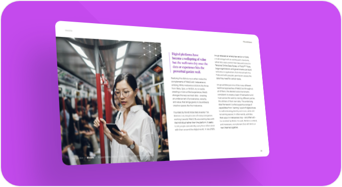 WebMe #TechVision Digital platforms have Inrupt released an enterprise version of Solid, become a wellspring of value a technology built on existing web standards, which lets users control their data and store it in but the well runs dry once the 49,50 Personal Online Data Stores, or Pods. Now, data or experience hits the large organizations and governments can build proverbial garden wall. websites or applications that interact with the Pods and with people’s permission access the Realizing this dichotomy is what makes the data they need for certain tasks. complements of Web3 and metaverse so enticing. While metaverse solutions like those Inrupt exhibits just one of the many different from Meta, Epic, or NVIDIA, try to tackle technical approaches of Web3, but throughout creating a more unified experience, Web3 all of them, the desired outcome remains changes the way we treat data – creating consistent: to create a layer of transaction and an undercurrent of provenance, veracity, trust across the web by making different parties and value, that brings gravity to boundlessly the arbiters of their own data. The underlying creative spaces like the metaverse. data framework is what supports a range of capabilities from “owning” a pair of digital shoes Founded by World Wide Web inventor Tim to authenticating identity and more, while still Berners-Lee, Inrupt is one of many companies remaining secure. In other words, activities working towards Web3. By associating data with that occur in metaverses may – and often will – the individual rather than the platform, it seeks be enabled by Web3. As such, Web3 is a critical, to let people consistently carry their information and necessary, complement that will bind our with them around the digital world. In late 2020, next internet together. Introduction // WebMe // Programmable World // The Unreal // Computing the Impossible 31