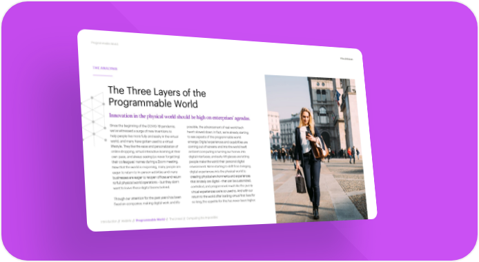 Programmable World #TechVision THE ANALYSIS The Three Layers of the Programmable World Innovation in the physical world should be high on enterprises’ agendas. Since the beginning of the COVID-19 pandemic, possible, the advancement of real-world tech we’ve witnessed a surge of new inventions to hasn’t slowed down. In fact, we’re already starting help people live more fully and easily in the virtual to see aspects of the programmable world world, and many have gotten used to a virtual emerge: Digital experiences and capabilities are lifestyle. They like the ease and personalization of coming out of screens and into the world itself; online shopping, virtual interactive learning at their ambient computing is turning our homes into own pace, and always seeing (so never forgetting) digital interfaces; and early AR glasses are letting their colleagues’ names during a Zoom meeting. people make the world their personal digital Now that the world is reopening, many people are environment. We’re starting to shift from bringing eager to return to in-person activities and many digital experiences into the physical world to businesses are eager to reopen offices and return creating physical environments and experiences to full physical world operations – but they don’t that innately are digital – that can be customized, want to leave these digital boons behind. controlled, and programmed much like the purely virtual experiences we’re so used to. And with our Though our attention for the past years has been return to the world after leading virtual-first lives for fixed on companies making digital work and life so long, the appetite for this has never been higher. Introduction // WebMe // Programmable World // The Unreal // Computing the Impossible