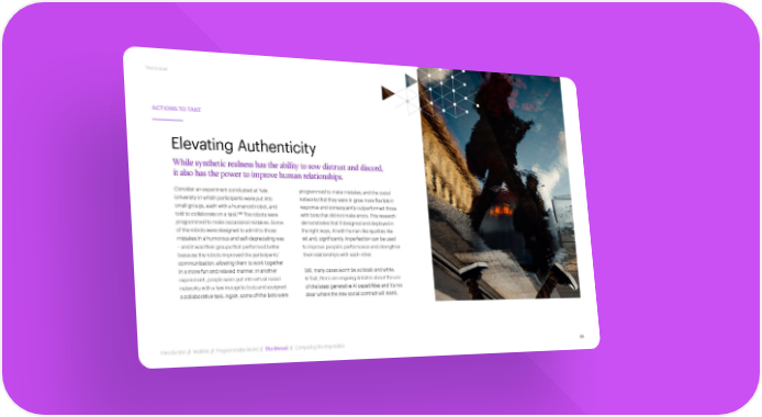 The Unreal ACTIONS TO TAKE Elevating Authenticity While synthetic realness has the ability to sow distrust and discord, it also has the power to improve human relationships. Consider an experiment conducted at Yale programmed to make mistakes, and the social University in which participants were put into networks that they were in grew more flexible in small groups, each with a humanoid robot, and response and consequently outperformed those 148 told to collaborate on a task. The robots were with bots that did not make errors. This research programmed to make occasional mistakes. Some demonstrates that if designed and deployed in of the robots were designed to admit to those the right ways, AI with human-like qualities like mistakes in a humorous and self-deprecating way wit and, significantly, imperfection can be used – and it was their groups that performed better to improve people’s performance and strengthen because the robots improved the participants’ their relationships with each other. communication, allowing them to work together in a more fun and relaxed manner. In another Still, many cases won’t be so black and white. experiment, people were put into virtual social In fact, there are ongoing debates about the use networks with a few incognito bots and assigned of the latest generative AI capabilities and it’s not a collaborative task. Again, some of the bots were clear where the new social contract will stand. Introduction // WebMe // Programmable World // The Unreal // Computing the Impossible 66