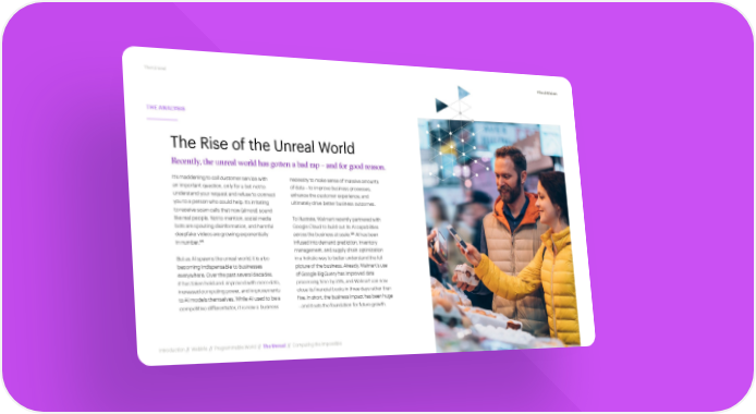 The Unreal #TechVision THE ANALYSIS The Rise of the Unreal World Recently, the unreal world has gotten a bad rap – and for good reason. It’s maddening to call customer service with necessity to make sense of massive amounts an important question, only for a bot not to of data – to improve business processes, understand your request and refuse to connect enhance the customer experience, and you to a person who could help. It’s irritating ultimately drive better business outcomes. to receive scam calls that now (almost) sound like real people. Not to mention, social media To illustrate, Walmart recently partnered with bots are spouting disinformation, and harmful Google Cloud to build out its AI capabilities 126 deepfake videos are growing exponentially across the business at scale. AI has been 125 infused into demand prediction, inventory in number. management, and supply chain optimization But as AI spawns the unreal world, it is also in a holistic way to better understand the full becoming indispensable to businesses picture of the business. Already, Walmart’s use everywhere. Over the past several decades, of Google BigQuery has improved data it has taken hold and improved with more data, processing time by 23%, and Walmart can now increased computing power, and improvements close its financial books in three days rather than to AI models themselves. While AI used to be a five. In short, the business impact has been huge competitive differentiator, it is now a business – and it sets the foundation for future growth. Introduction // WebMe // Programmable World // The Unreal // Computing the Impossible